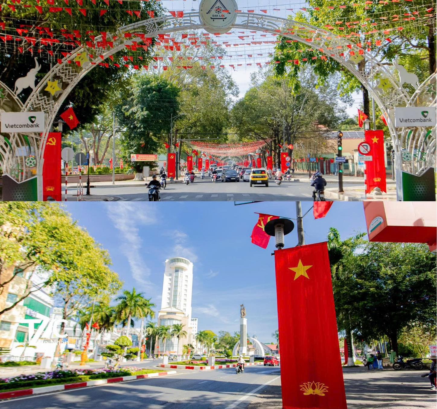Buon Ma Thuot Ward has decorated numerous clusters of banners, national flags, party flags, and propaganda ribbons along the streets, creating a vibrant atmosphere to welcome the 14th National Congress of the Party. Photo: T.N