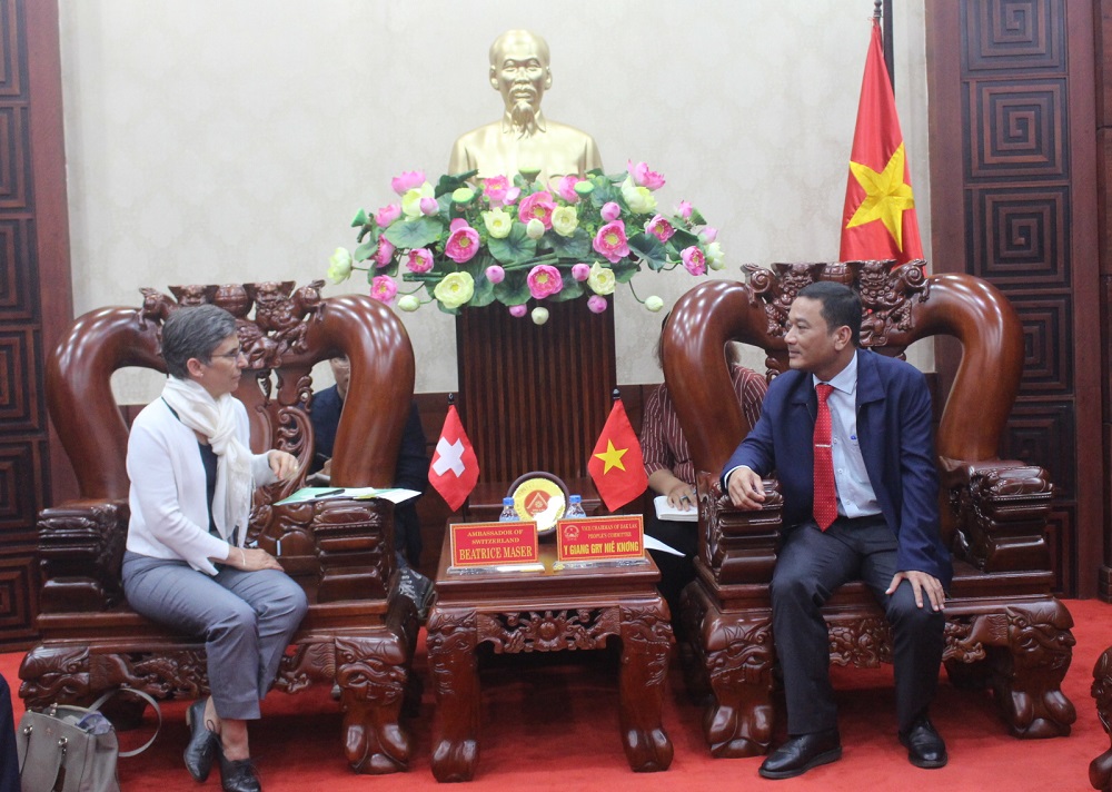 Chiều 7/11, Phó Chủ tịch UBND tỉnh Y Giang Gry Niê Knơng đã có buổi gặp mặt, chào xã giao bà Beatrice Maser Mallor - Đại sứ Thụy Sỹ tại Việt Nam cùng đoàn công tác nhân dịp đoàn đến thăm và làm việc tại tỉnh.