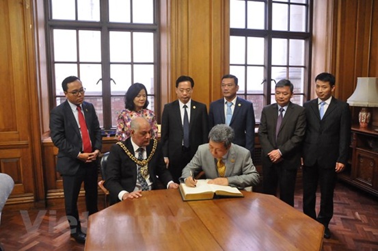 Đại sứ Trần Ngọc An đại diện đoàn Việt Nam viết lưu ký vào cuốn sổ của Hội đồng thành phố Manchester, Vương quốc Anh. (Ảnh: tư liệu)