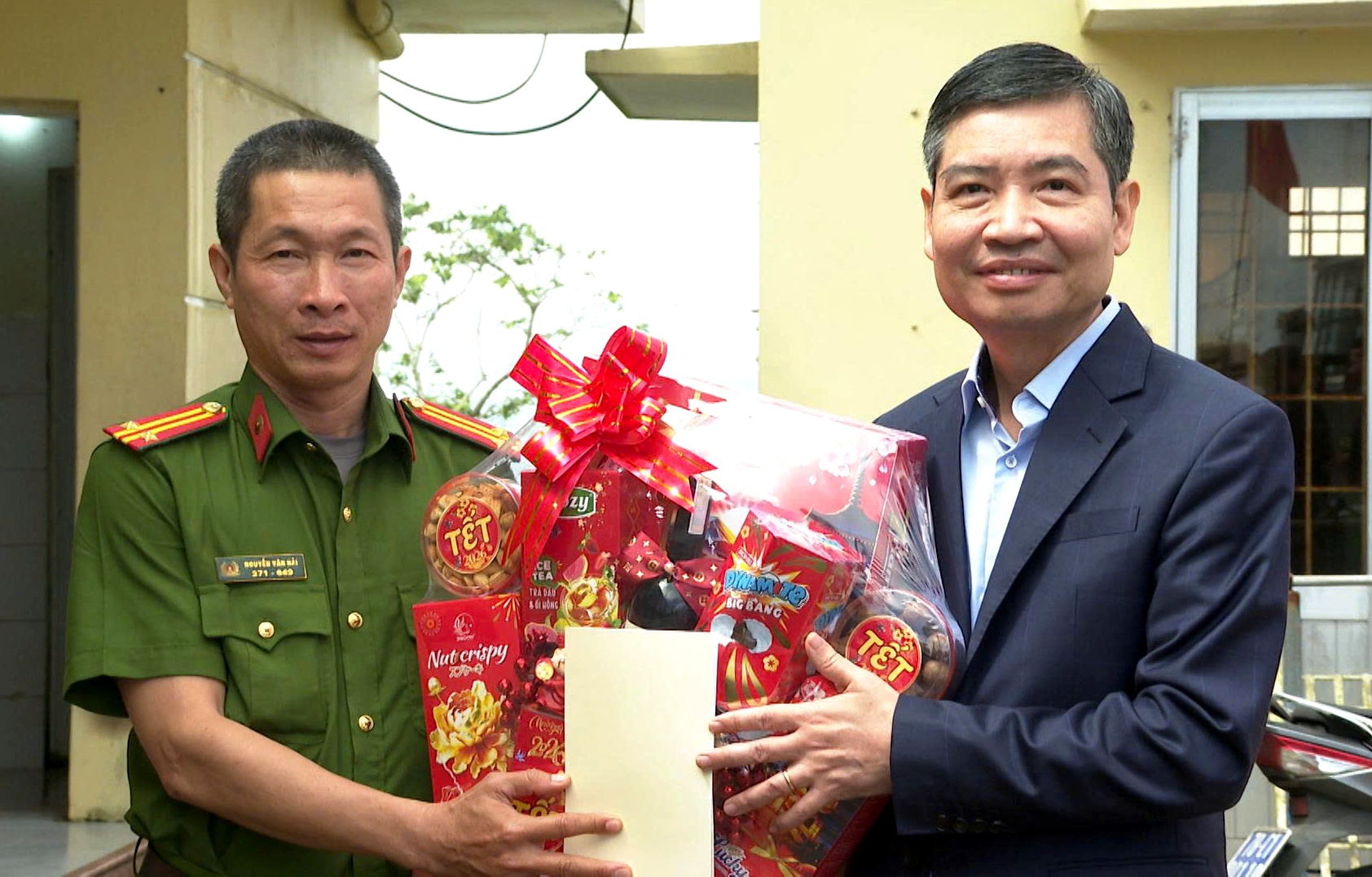 Đồng chí Tạ Anh Tuấn, Phó Bí thư Tỉnh ủy, Chủ tịch UBND tỉnh tặng quà chúc mừng năm mới cán bộ, chiến sĩ lực lượng Bảo vệ mục tiêu Chóp Chài.