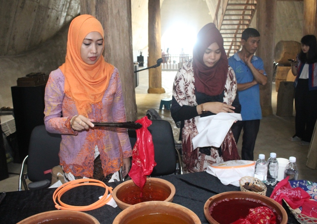 Nghệ nhân thực hành công đoạn cuối cùng nhuộm vải Batik để làm quà cho du khách