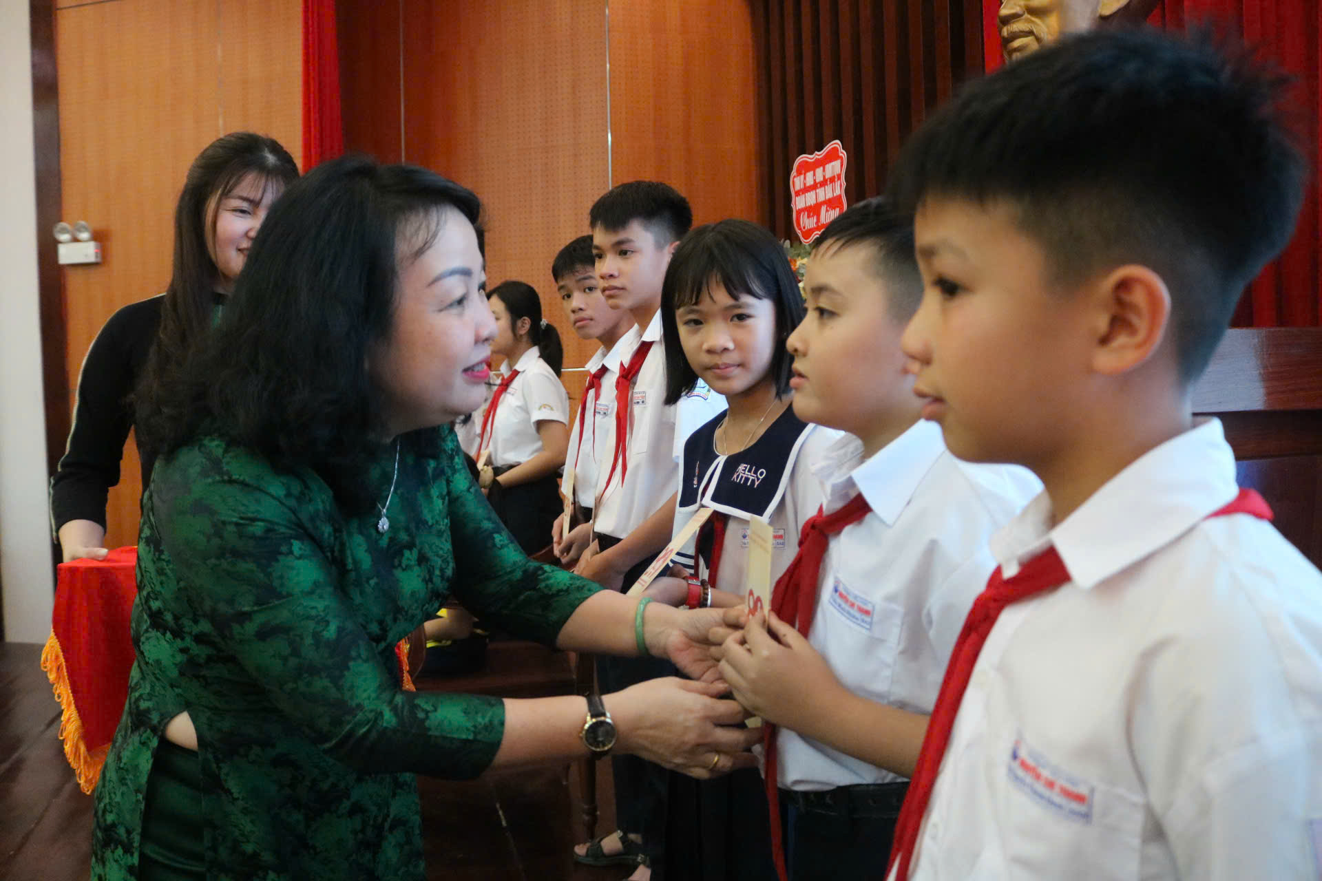 Phó Bí thư Thường trực Tỉnh ủy Cao Thị Hòa An tặng quà các em học sinh nghèo vượt khó, học giỏi trên địa bàn tỉnh.