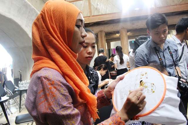 Nghệ nhân Indonesia hướng dẫn du khách phủ sáp ong lên vải Batik