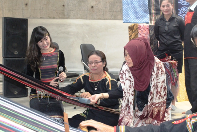Là một trong những nghệ nhân thâm niên với nghề dệt thổ cẩm, bà H’Yam Bkrông ở buôn Tơng Jú, xã Ea Kao, TP. Buôn Ma Thuột, Đắk Lắk cũng không giấu được niềm vinh hạnh và tự hào khi được tham gia chương trình giao lưu văn hoá, giới thiệu thổ cẩm Ê-đê với mọi người, đặc biệt là nước bạn Indonesia. Bao nhiêu năm theo nghề, bà luôn nâng niu, gửi gắm tình yêu nghề qua từng sản phẩm làm ra, và xa hơn đó là mong muốn lưu giữ, phát triển nghề dệt thổ cẩm truyền thống đối với phụ nữ Tây Nguyên đến thế hệ mai sau.