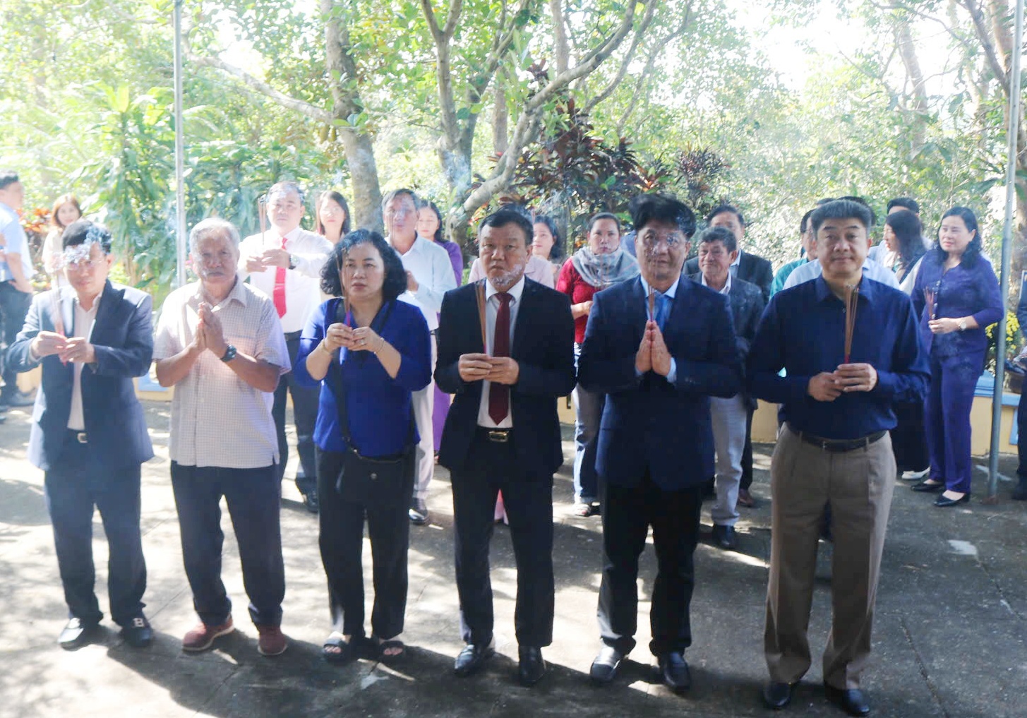 Các đồng chí lãnh đạo, nguyên lãnh đạo tỉnh và lãnh đạo các sở, ngành, địa phương thắp hương tưởng niệm tại đập Đồng Cam.