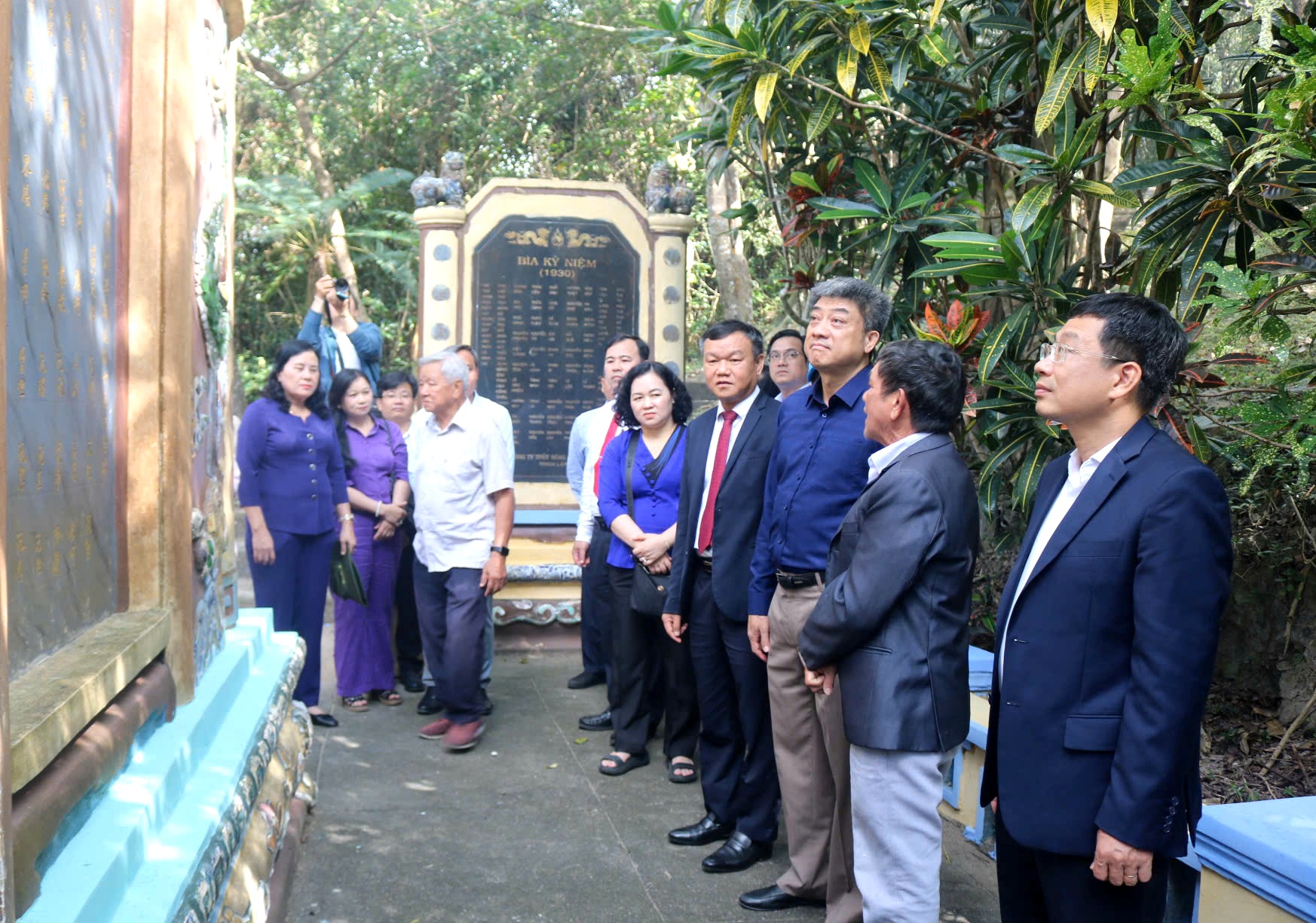 Các đồng chí lãnh đạo, nguyên lãnh đạo tỉnh và lãnh đạo các sở, ban, ngành, địa phương tham quan Bia tưởng niệm 54 người đã anh dũng hy sinh trong quá trình xây dựng Đập Đồng Cam.