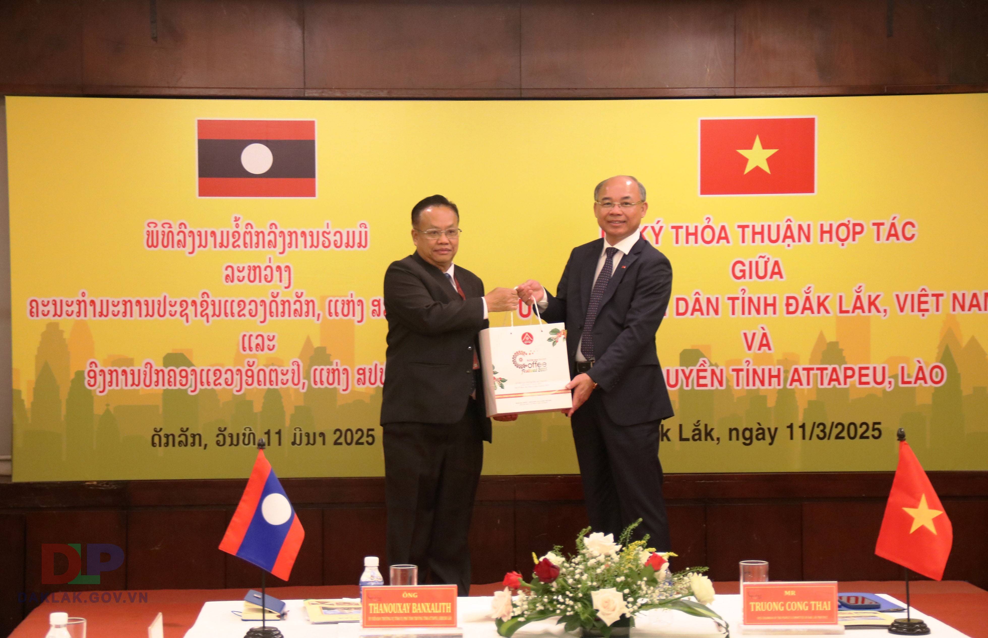 Phó Chủ tịch UBND tỉnh Đắk Lắk Trương Công Thái tặng quà cho ông Thanouxay BANXALITH, Thường vụ Tỉnh ủy, Phó Tỉnh trưởng tỉnh Attapeu (CHDCND Lào).
