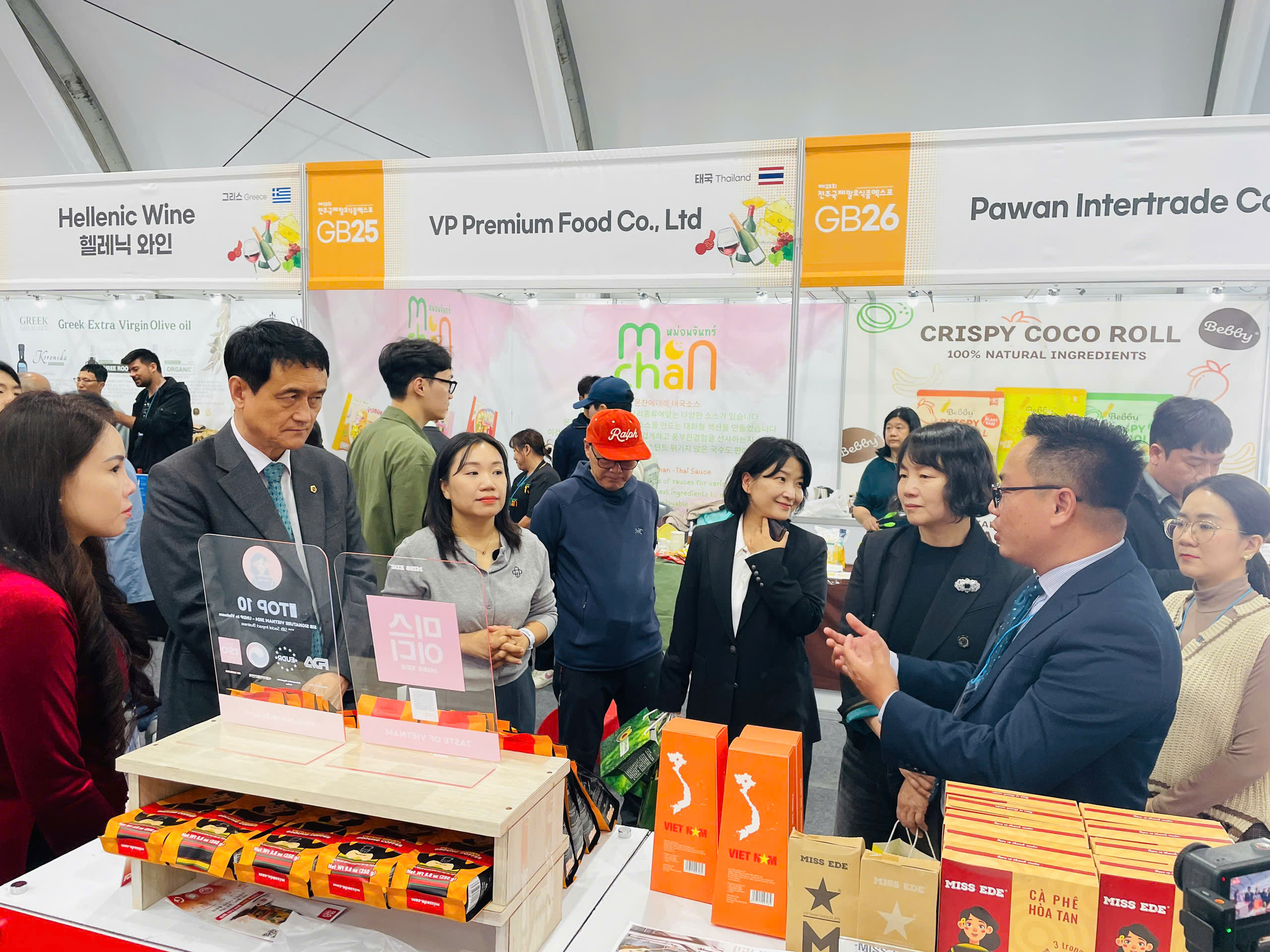Ông Kim Hee Su – Phó Nghị trưởng Nghị viện tỉnh Jeonbuk cùng đại diện bộ phận Hợp tác quốc tế và Hỗ trợ người nước ngoài thăm gian hàng quảng bá sản phẩm của doanh nghiệp tỉnh Đắk Lắk-Ảnh : Sở Công Thương
