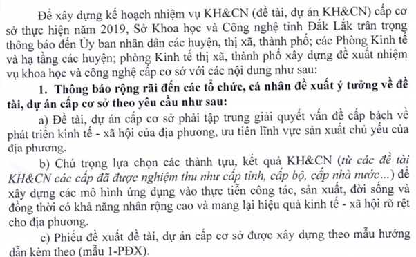 >Thông báo xây dựng danh mục đề xuất đặt hàng nhiệm vụ khoa học và công nghệ cấp cơ sở thực hiện năm 2019 đối với cấp huyện