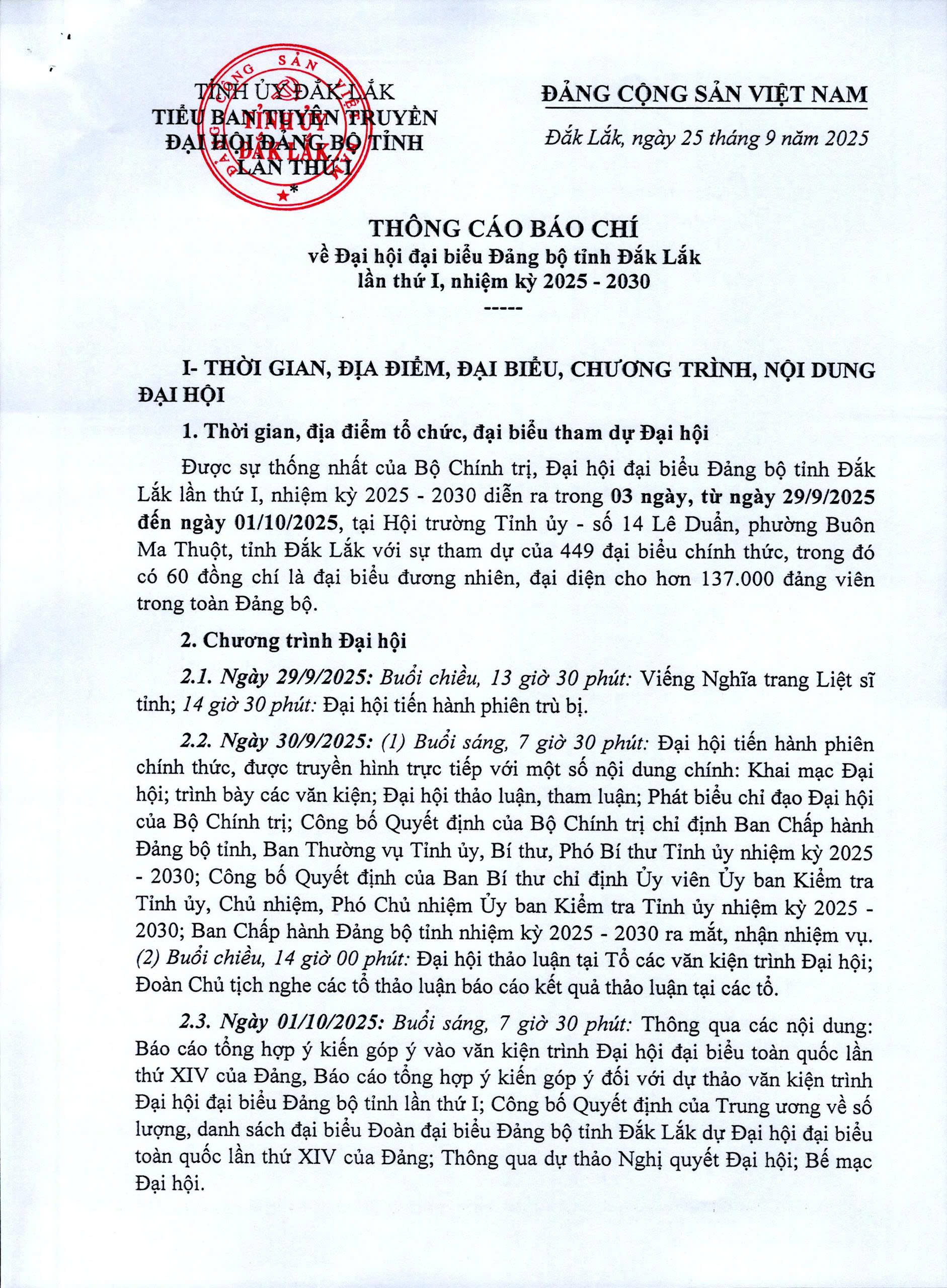 Đại hội đại biểu Đảng bộ tỉnh Đắk Lắk lần thứ I, nhiệm kỳ 2025-2030 sẽ diễn ra trong 03 ngày (từ ngày 29/9 đến ngày 01/10/2025) tại Hội trường Tỉnh ủy, số 14 Lê Duẩn, phường Buôn Ma Thuột, tỉnh Đắk Lắk với sự tham dự của 449 đại biểu chính thức, trong đó có 60 đồng chí là đại biểu đương nhiên, đại diện cho hơn 137.000 đảng viên trong toàn Đảng bộ.