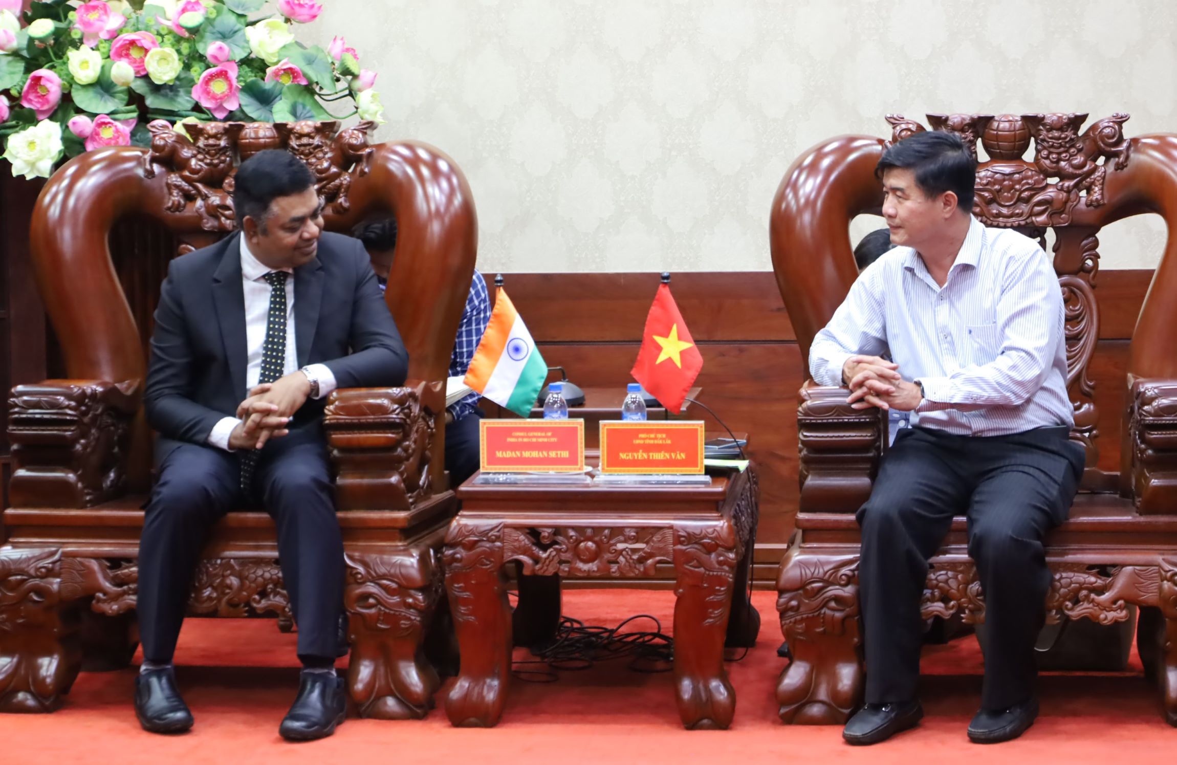 Phó Chủ tịch UBND tỉnh Nguyễn Thiên Văn trò chuyện cùng ông Madan Mohan Sethi - Tổng Lãnh sự Ấn Độ tại TP. Hồ Chí Minh.